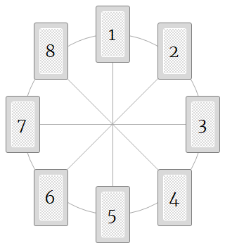 The Wheel of the Year spread is used for forecasting what the querent can expect over the next year. It is very subjective and can allude to actions, achievements, obstacles, relationships…really anything. The layout is as depicted, but the reading generally begins with the next occurring sabbat.